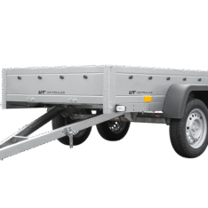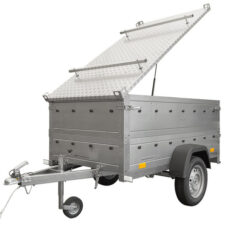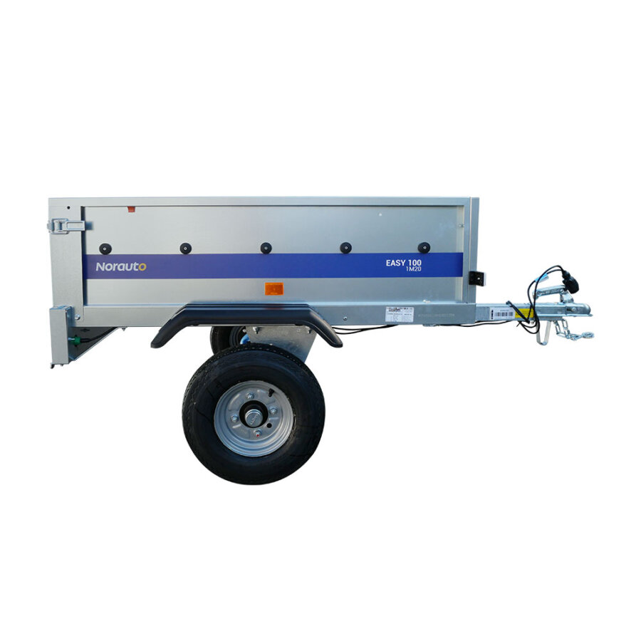 Cette remorque vous est livrée entièrement montée et possède des garde-boue en plastique, un timon droit, une ridelle arrière amovible et rabattable.